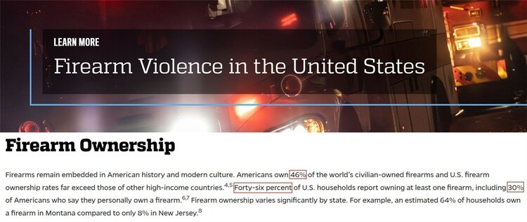 约翰斯·霍普金斯大学枪支暴力解决方案中心2023年发布的数据显示,世界上近一半(46%)的民用枪支在美国;近一半(46%)的美国家庭报告拥有至少一把枪,其中30%的人承认自己拥有枪支。