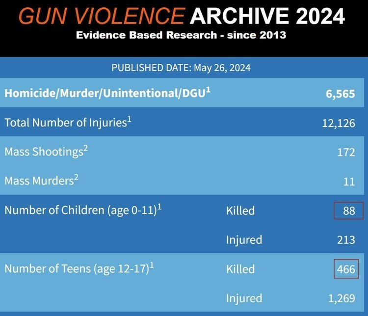 而根据美国“枪支暴力档案”网站的数据,截至5月26日,今年以来全美已有554名儿童和青少年因枪击身亡。