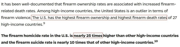 △约翰斯·霍普金斯大学枪支暴力解决方案中心官网:数据表明,枪支拥有率与枪支相关的死亡率上升密切相关。在高收入国家中,美国的枪支拥有率和枪支引发的死亡率最高,是其他高收入国家的近25倍。