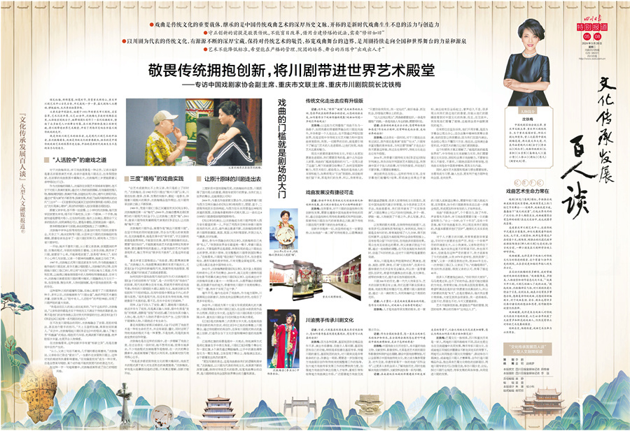 本期文化传承发展百人谈,我们专访了中国戏剧家协会副主席、重庆市文联主席、重庆市川剧院院长沈铁梅。在她从艺的40余年里,带领团队创作了一系列经典剧目,将川剧带进世界艺术殿堂,开创了用西洋交响乐伴奏川剧传统戏的先河。她认为,守正创新的前提是敬畏传统,需要“修旧如旧”。详情关注今日五、八连版。