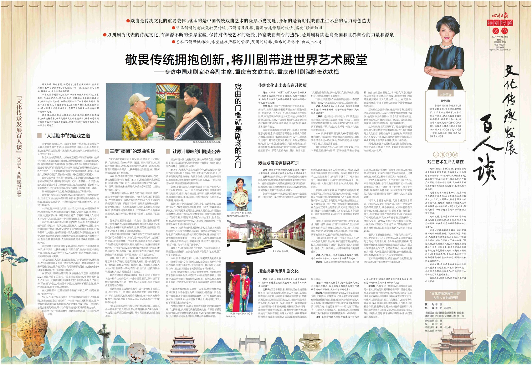 四川日报全媒体“文化传承发展百人谈”大型人文融媒报道持续推出,今日《四川日报》连版推出第三十五期,专访中国戏剧家协会副主席、重庆市文联主席、重庆市川剧院院长沈铁梅。