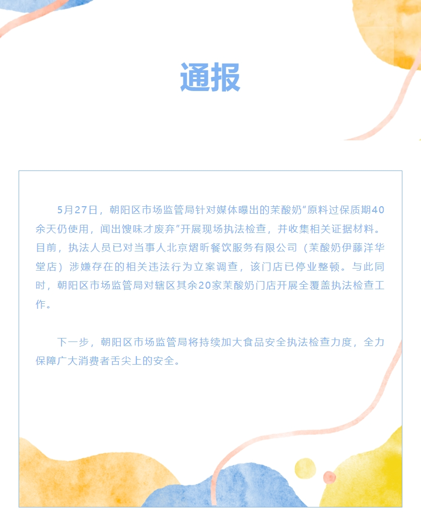 5月27日,朝阳区市场监管局针对媒体曝出的茉酸奶“原料过保质期40余天仍使用,闻出馊味才废弃”开展现场执法检查,并收集相关证据材料。目前,执法人员已对当事人北京熠昕餐饮服务有限公司(茉酸奶伊藤洋华堂店)涉嫌存在的相关违法行为立案调查,该门店已停业整顿。与此同时,朝阳区市场监管局对辖区其余20家茉酸奶门店开展全覆盖执法检查工作。
