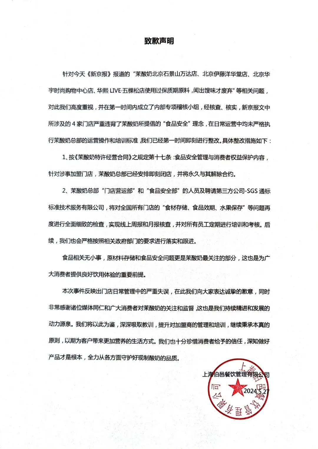 茉酸奶称,对于媒体曝光的相关问题高度重视,并在第一时间内成立了内部专项稽核小组,经核查、核实,报道所涉及的4家门店严重违背了茉酸奶所提倡的“食品安全”理念,在日常运营中均未严格执行茉酸奶总部的运营操作和培训标准,茉酸奶方面表示已经第一时间即刻进行整改。本次事件反映出门店日常管理中的严重失误,向大家表达诚挚的歉意。