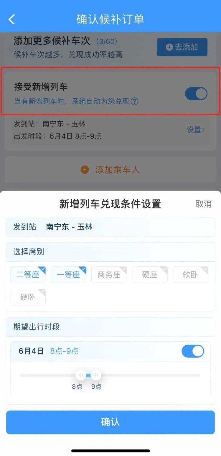 ◆ 临时新增旅客列车席位优先配售给已提交候补订单的旅客。旅客在提交候补订单时,可选择接受购买符合出行需求的新增旅客列车车票,如铁路部门临时新增旅客列车,在车票起售时,铁路12306将自动优先配售给已提交候补订单的旅客,旅客无需人工查询增开列车信息再购票。