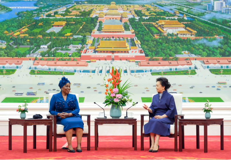 5月28日下午,国家主席习近平夫人彭丽媛在北京为陪同赤道几内亚总统奥比昂对中国进行国事访问的赤道几内亚总统夫人康斯坦西娅举行茶叙活动。新华社记者 丁林 摄