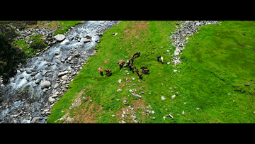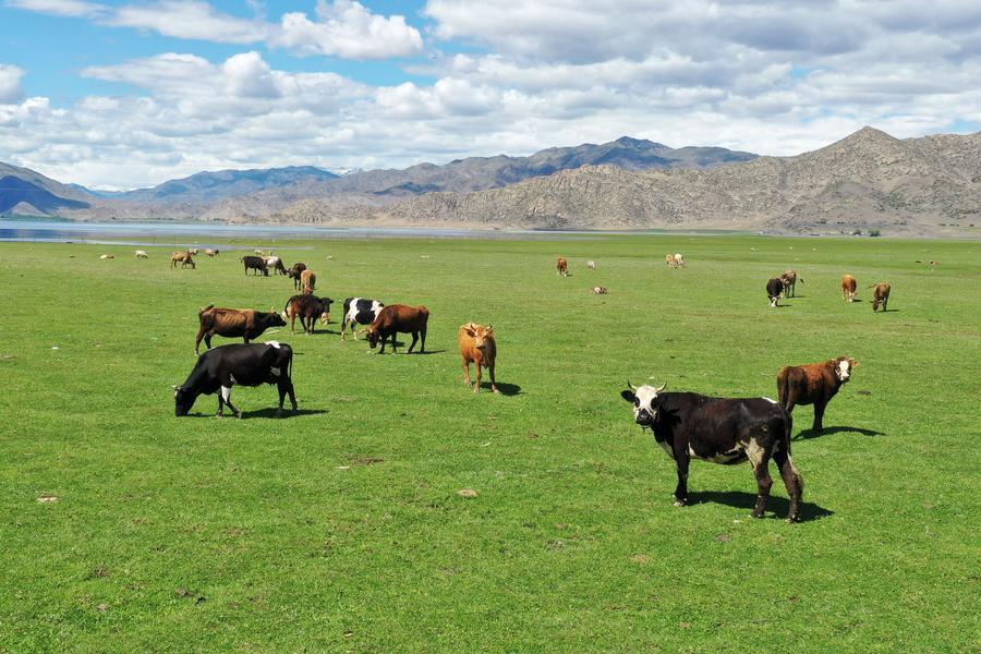 这是2020年6月7日在新疆可可托海世界地质公园伊雷木湖景区拍摄的牛羊(无人机照片)。 新华社记者 丁磊 摄