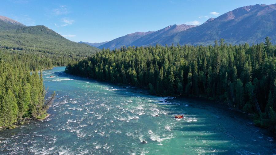 游客在新疆阿勒泰地区喀纳斯景区体验漂流项目(2023年7月19日摄,无人机照片)。 新华社记者 丁磊 摄