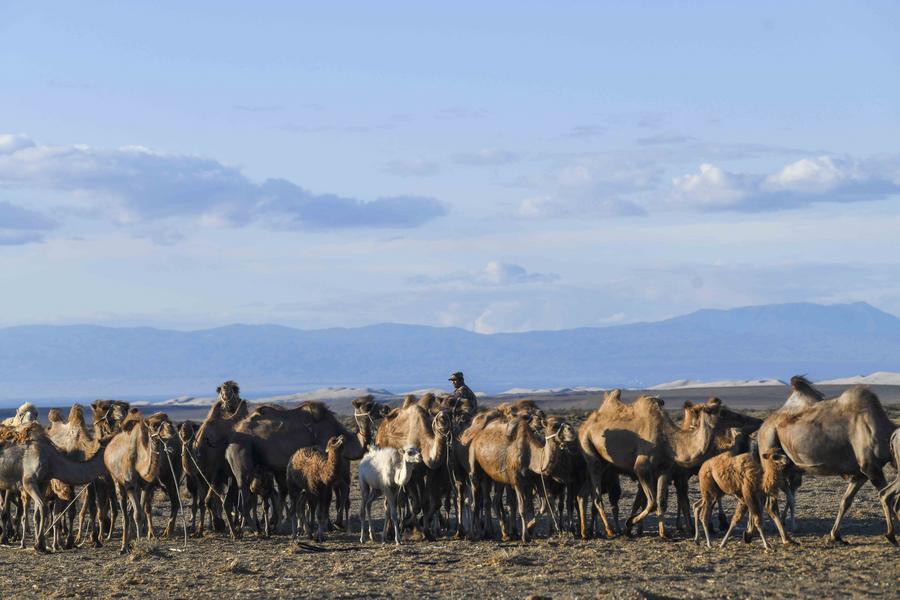 在新疆吉木乃县万驼园内,一位牧民在放骆驼(2020年6月21日摄)。 新华社记者 赵戈 摄