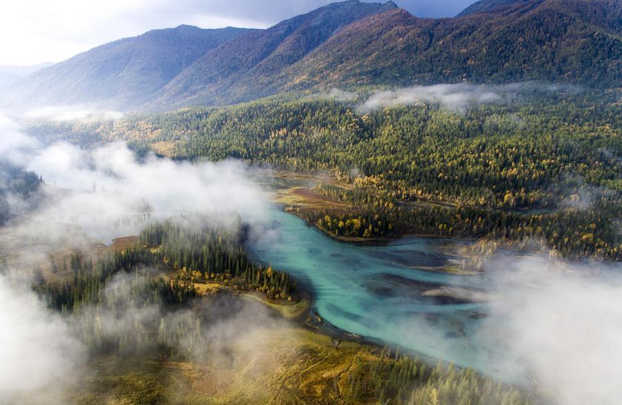 2019年9月24日无人机拍摄的位于新疆阿勒泰地区的喀纳斯景区风光。 新华社记者 王菲 摄
