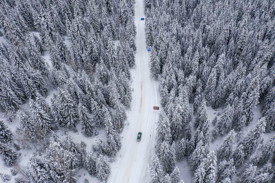 自驾游客在新疆阿勒泰地区喀纳斯景区行驶(2023年1月8日摄,无人机照片)。 新华社记者 胡虎虎 摄