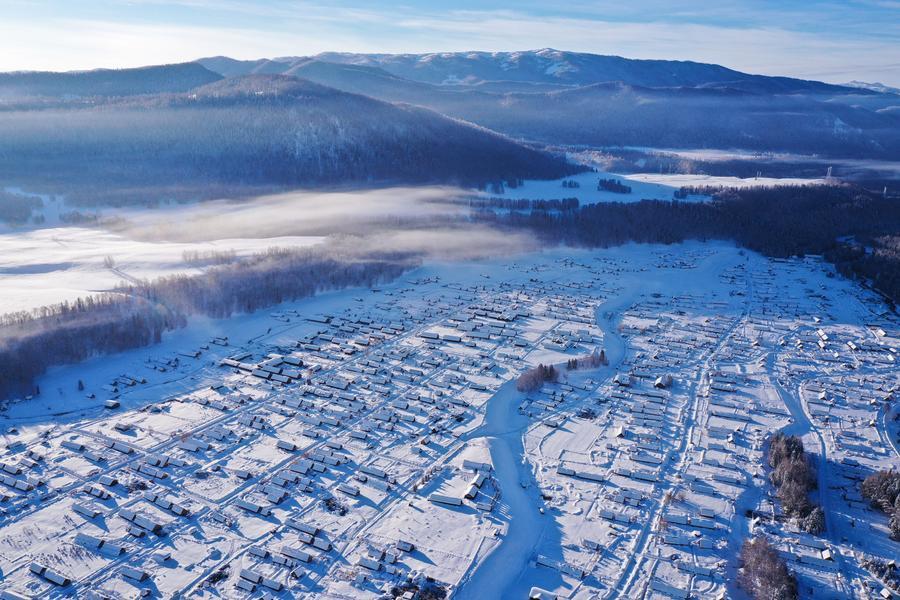 2024年1月17日拍摄的新疆阿勒泰地区布尔津县禾木村(无人机照片)。 新华社记者 李响 摄