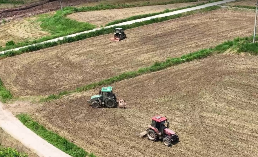 这边收割机收获完小麦,那边的旋耕机已下田作业,对土壤进行揭板、碎实、粉碎秸秆,为接下来种植水稻做准备。