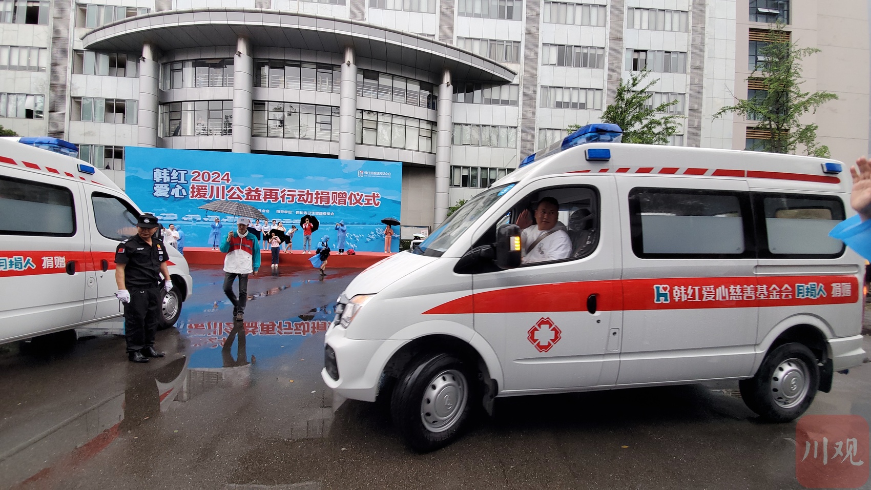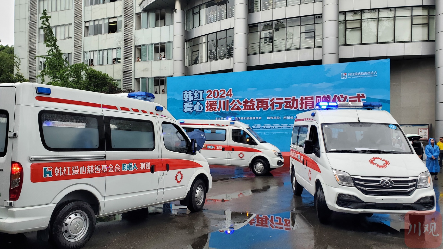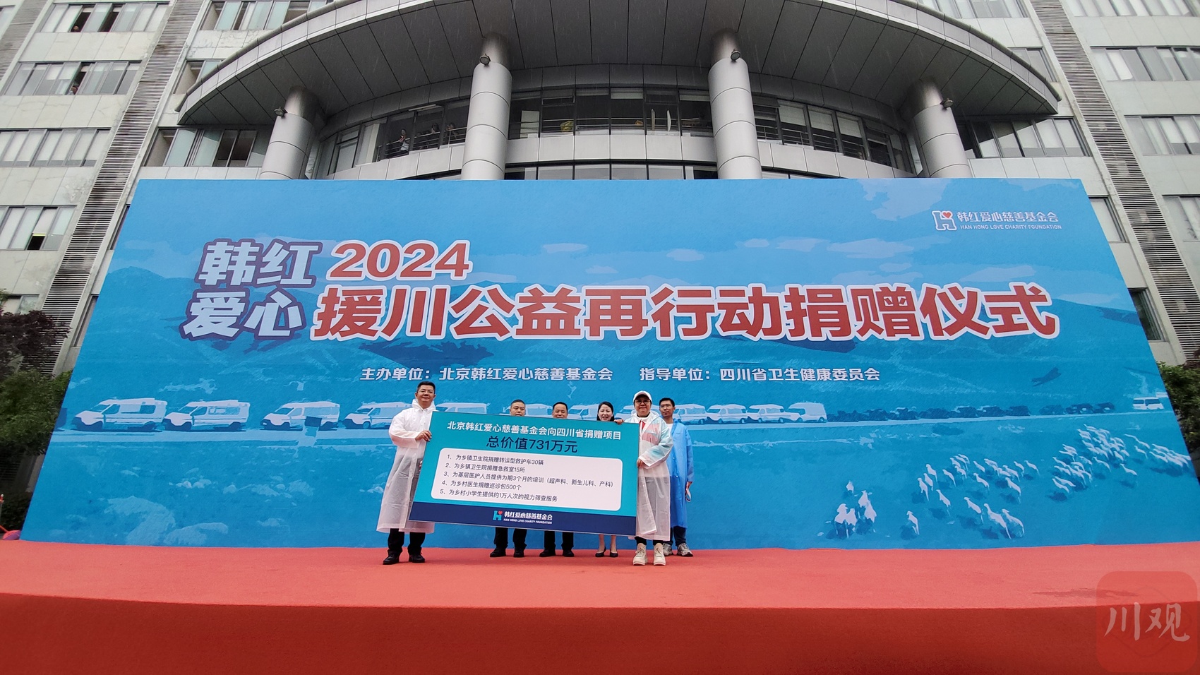 本年度,韩红基金会为四川省捐赠的项目总价值为731万。仪式现场,捐赠的30辆转运型救护车依次出发。