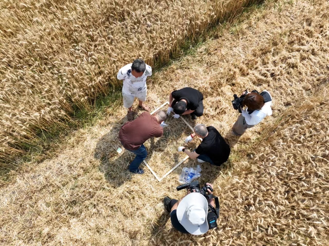 工作人员正在田间收集麦穗和麦粒。受访者供图