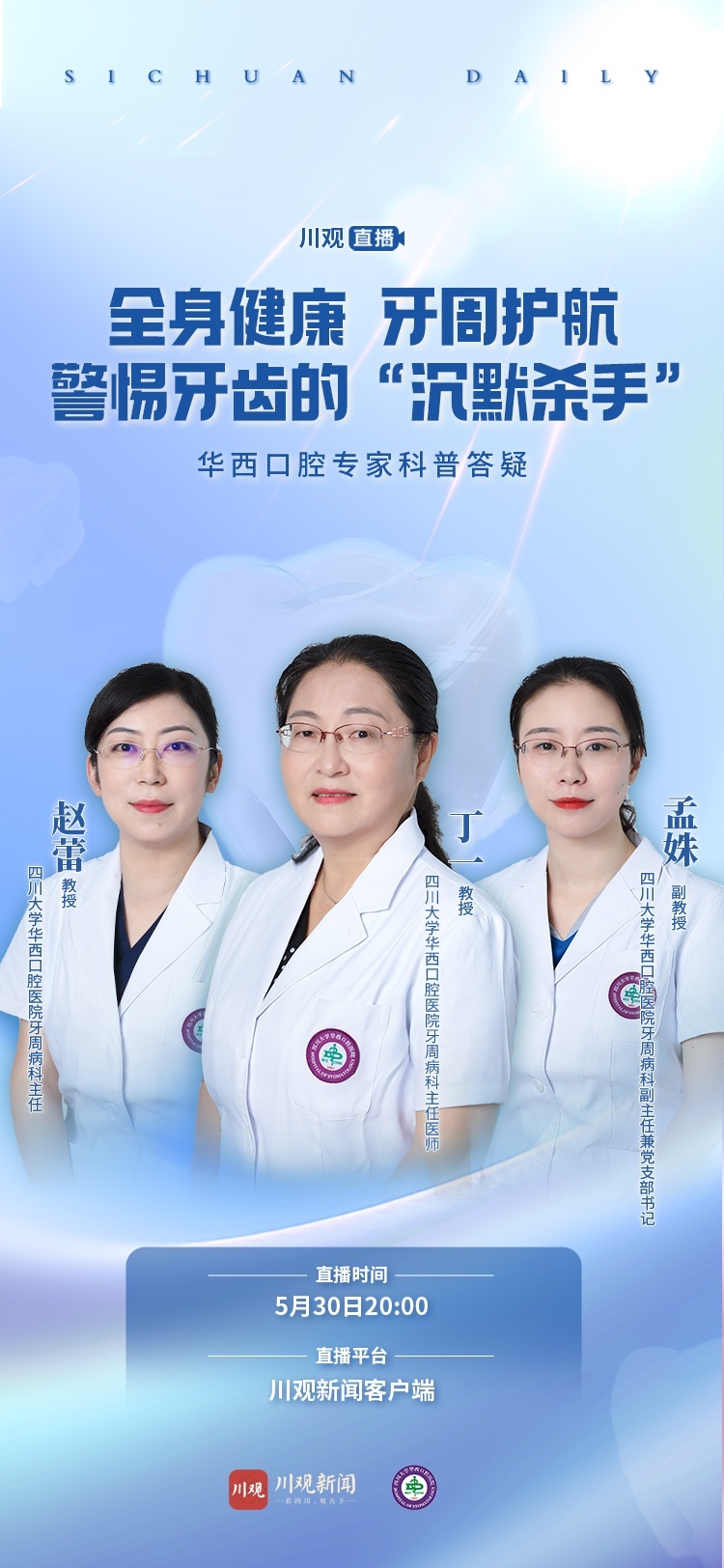 全身健康,牙周护航。5月30日,川观新闻携手四川大学华西口腔医院开展健康主题直播,邀请三位华西口腔专家为我们科普讲解,答疑解惑。