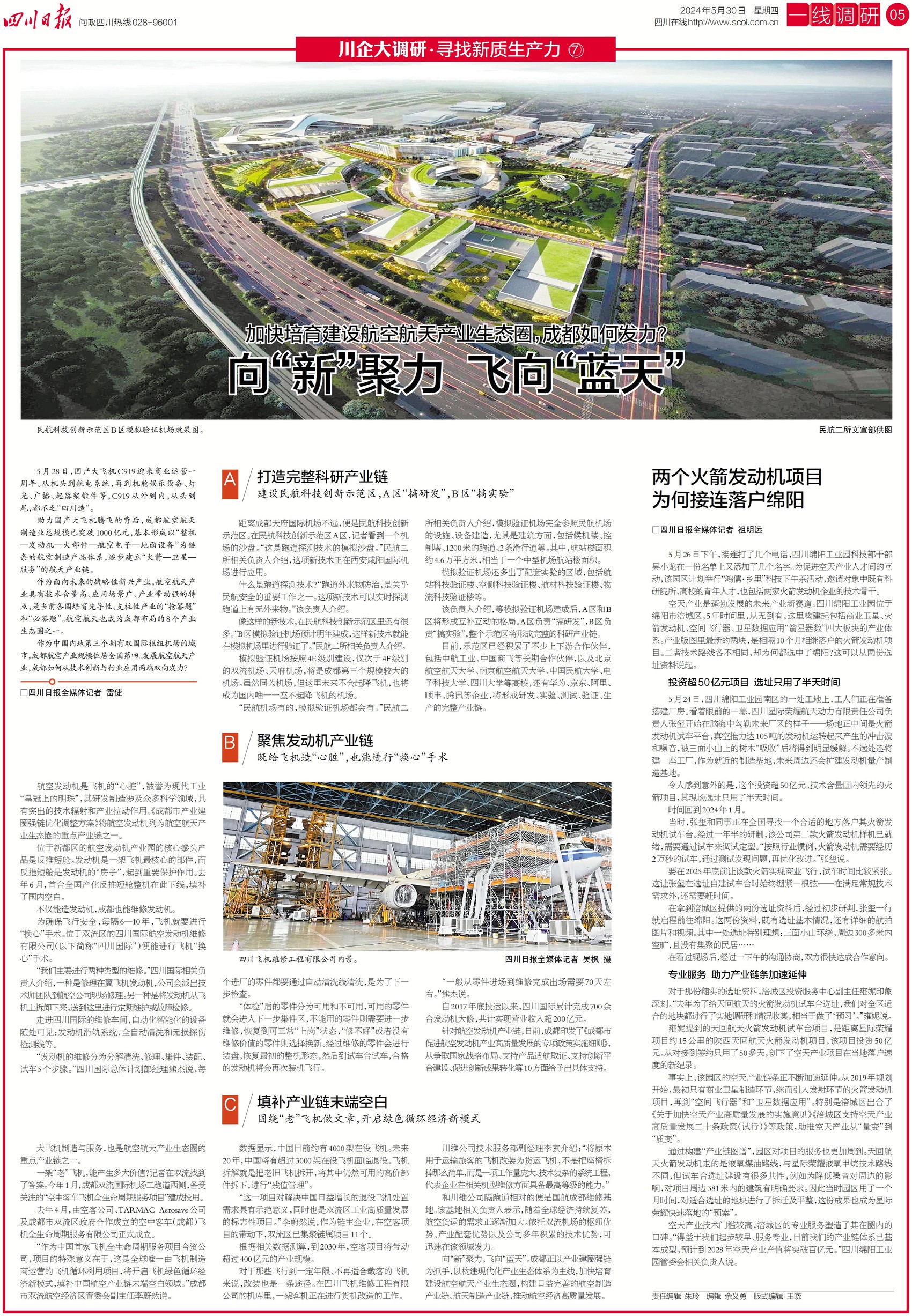近年来,成都加快培育建设航空航天产业生态圈,取得喜人成绩。这不仅体现在成都成为双国际枢纽机场城市、助力国产大飞机C919腾飞,更体现在成都航空航天制造业总规模突破千亿元大关,正逐步建立“火箭—卫星—服务”的航天产业链等进一步发展动态。关注今日五版,直击成都在发展航空航天产业上一手抓技术创新、一手抓行业应用的双向发力。