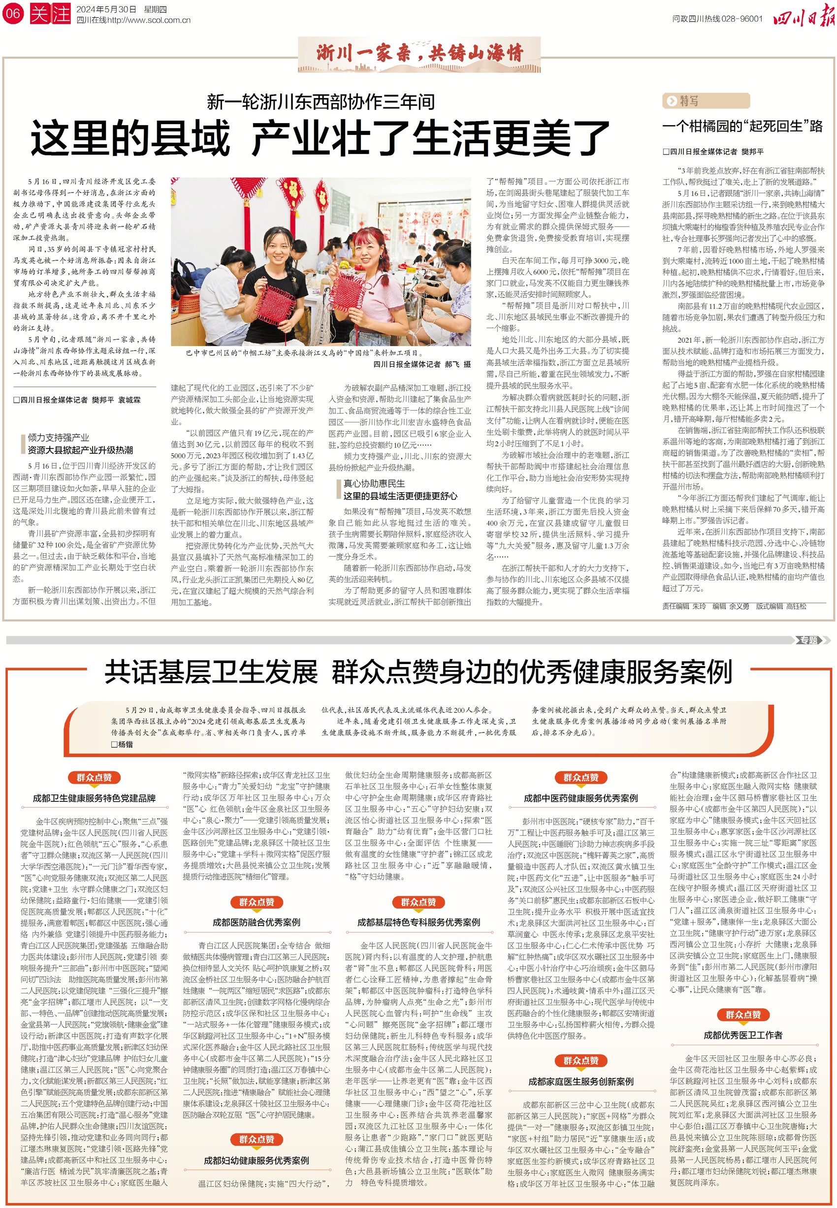 地方特色产业不断壮大,群众生活幸福指数不断提高——这是在浙江倾力支持下,川北、川东不少县域当下呈现的新特征。今日六版,我们来到最基层,为您呈现新一轮浙川东西部协作三年来两地干部群众共同努力下结出的累累硕果。