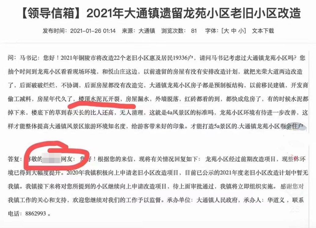 澎湃新闻(www.thepaper.cn)注意到,铜陵市郊区人民政府网站“领导信箱”栏目曾在2021年公开回复过一位龙苑小区居民吴先生的留言,但相关网页内容已在今年5月28日被删除。