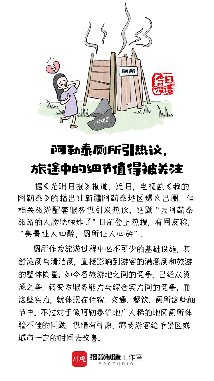 近日,电视剧《我的阿勒泰》的播出让新疆阿勒泰地区爆火出圈,但相关旅游配套服务也引发热议。话题“去阿勒泰旅游的人膀胱快炸了”日前登上热搜,有网友称,“美景让人心醉,厕所让人心碎”。对此,你怎么看?