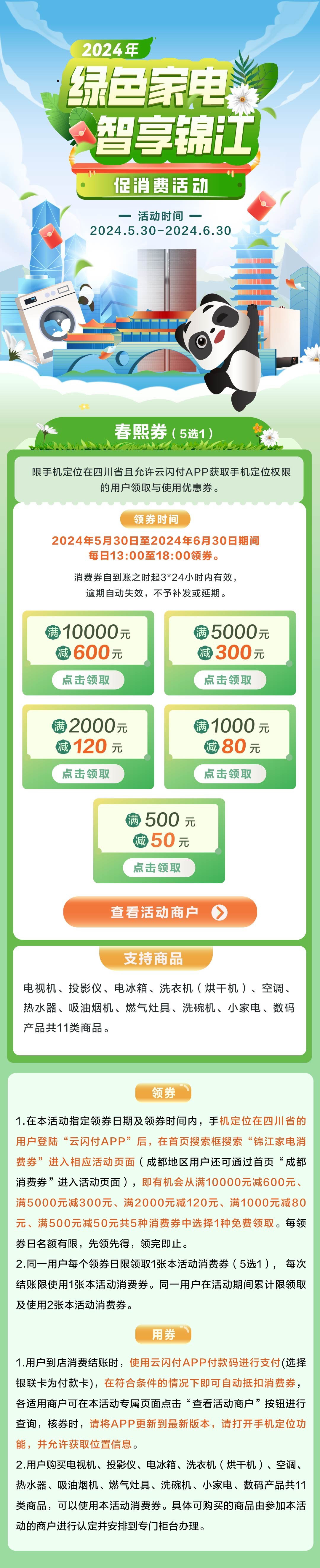 在本活动指定领券日期及领券时间内,手机定位在四川省的用户登陆“云闪付APP”后,成都地区用户进入首页“成都消费券”、市州地区用户在首页搜索框搜索“锦江家电消费券”进入相应活动页面领取“春熙券”,先到先得,领完为止。