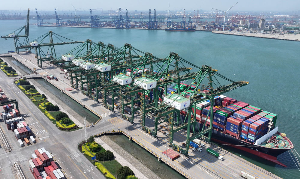 货轮靠泊在天津港太平洋国际集装箱码头装载货物(无人机照片,5月29日摄)。新华社记者 赵子硕 摄