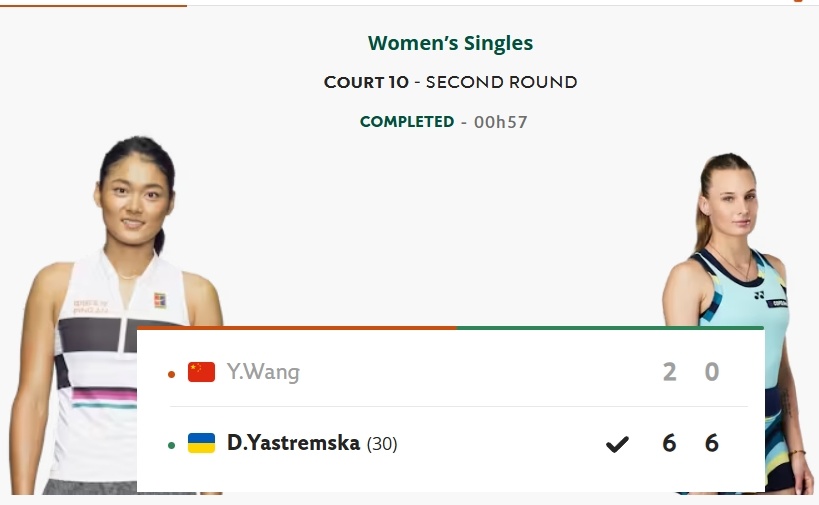 比赛开始后,王雅繁遭遇了进攻型球员雅斯特列姆斯卡的猛烈冲击。首盘比赛,王雅繁连丢4局1:5落后。虽然在第7局成功破发,但随后被对手回破,王雅繁以2:6先丢一盘。第二盘比赛,王雅繁明显在节奏上处于下风,最终以0:6再丢一盘,大比分0:2出局。