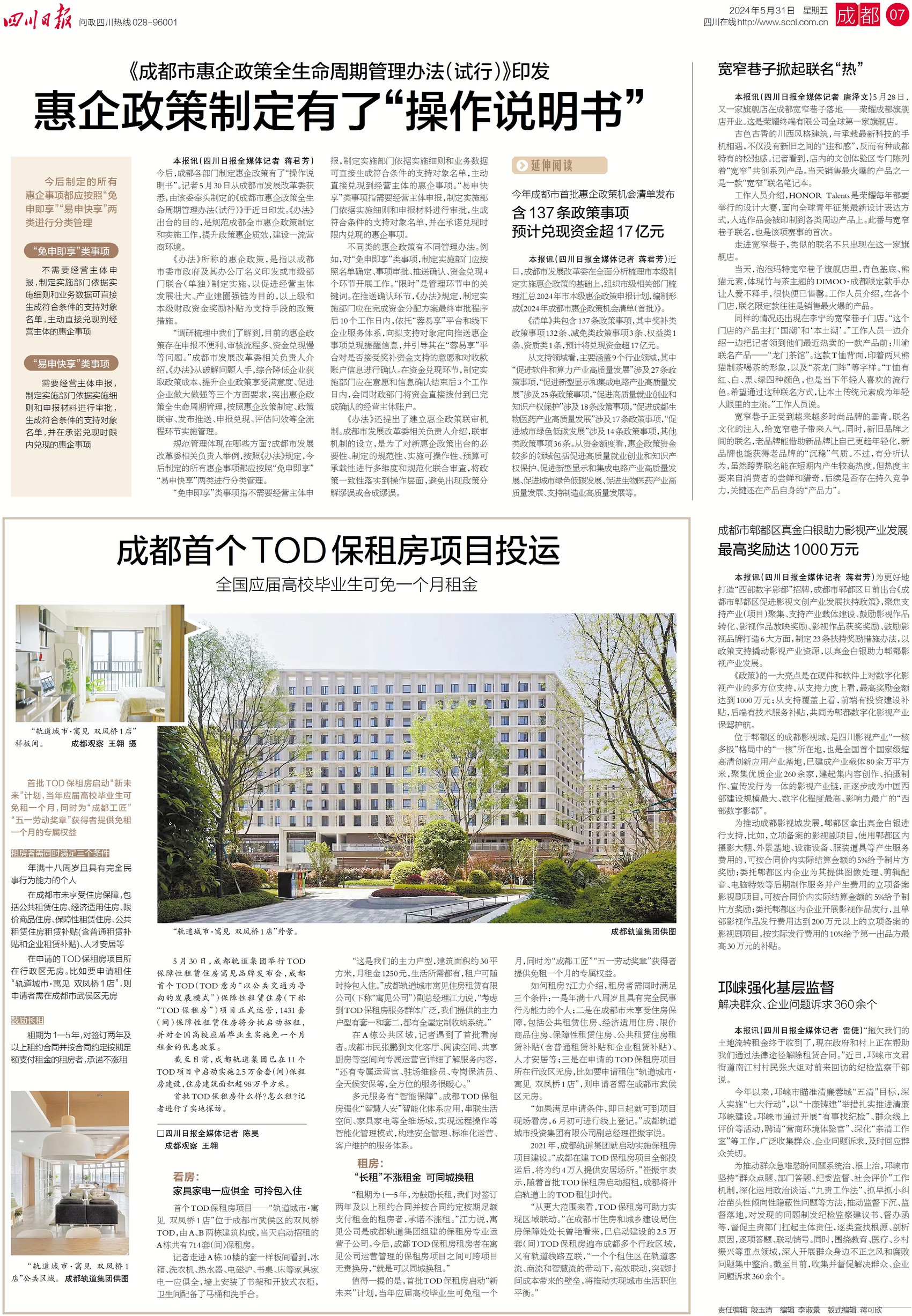 5月30日,成都市首个TOD保租房项目——“轨道城市·寓见 双凤桥1店”正式运营。小琳进行了实地探访,30平方米的主力户型月租金1250元,各种家具家电一应俱全,可拎包入住,还有专属运营官、全天候安保等提供全方位服务。当年应届高校毕业生、“成都工匠”、“五一劳动奖章”获得者还有免租一个月的专属权益。首批TOD保租房什么样?租房应满足什么条件?更多详情请看今日七版。