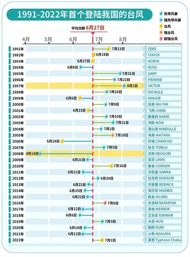 每年7月至9月正是台风多发季节。一般来说,每年首个登陆我国的台风平均登陆时间在6月27日。最早首个登陆我国的台风为2008年第1号台风“浣熊”,于4月18日在海南登陆。