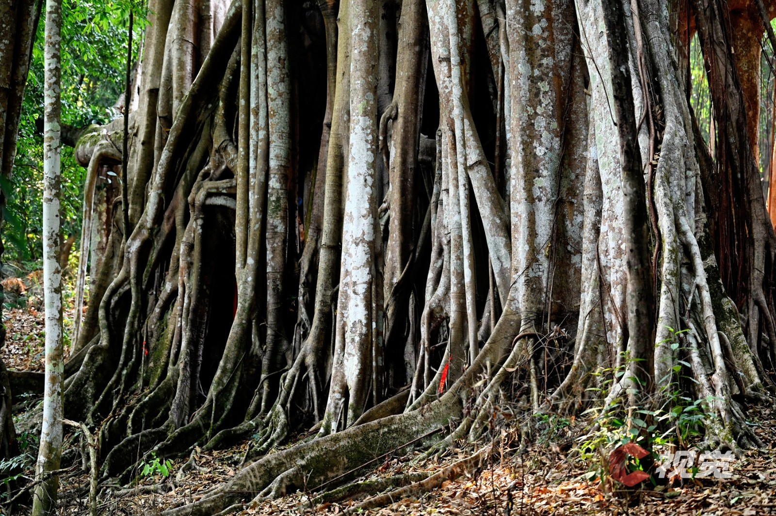 榕树气根连成一片,树形千姿百态,似虎啸山林,似象吼冲天,更似龙飞凤舞,在气根间穿行, 犹如漫步原始森林。德宏人把榕树称为大青树,只种不砍,于是形成了德宏风光的一大特色,把德宏的山水衬托得更加妩媚秀丽。
