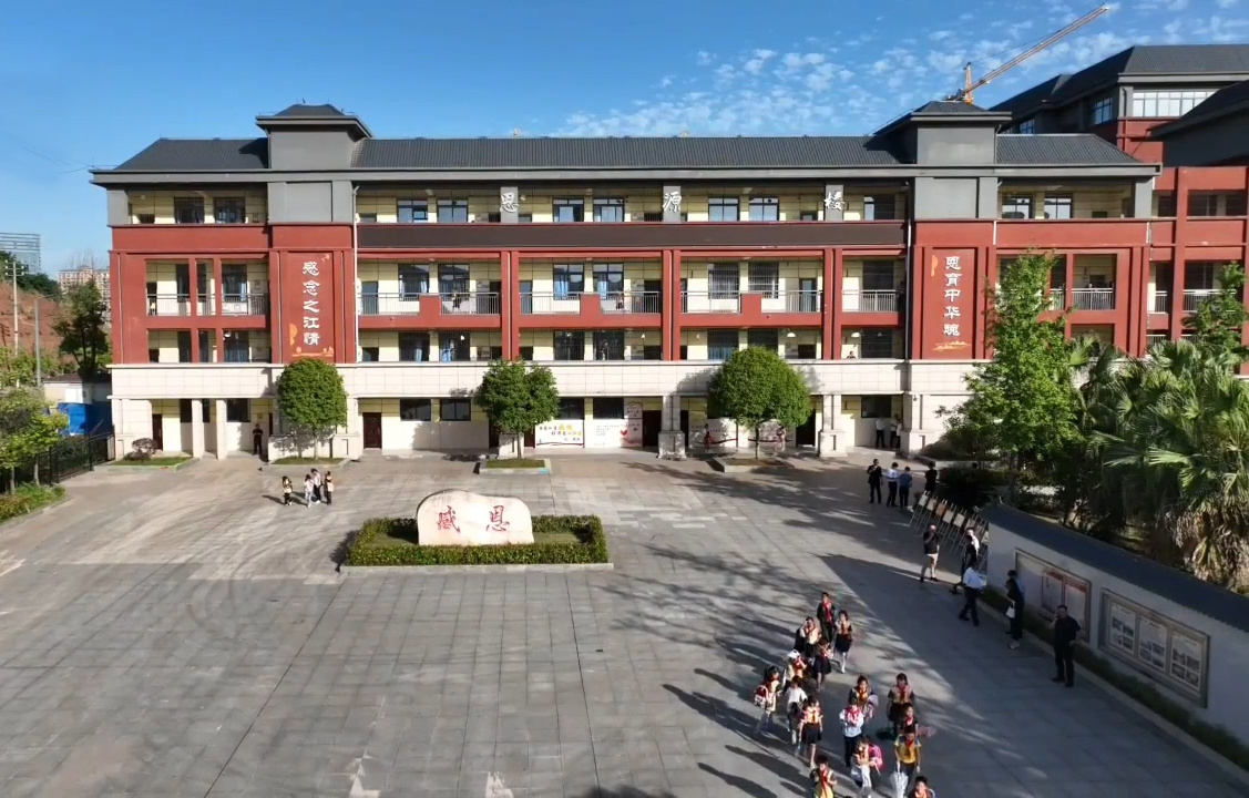 眼前,高大的米白色拱门左右两侧红底白字写着一副对联:培根铸魂报效祖国,启智增慧奠基人生。拱门正上方,写着“之江小学”几个大字的牌匾高悬。从空中俯瞰整个校园,“天”字形的教学楼大气端庄,校园绿树成荫。