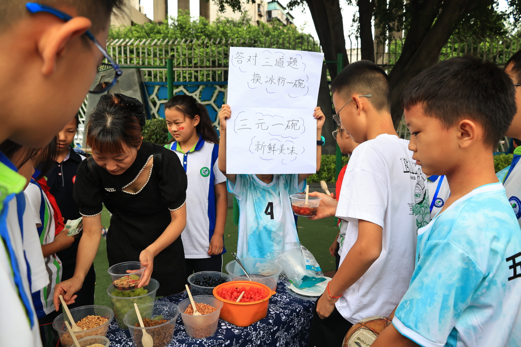 活动现场,孩子们有的拿出自己制作的手工艺品,有的摆出了家中闲置的书籍和玩具,还有的带来了自己设计制作的“水果拼盘”。种类繁多的“商品”、各具风格的海报、花式的广告牌、独特的广告语让人眼花缭乱,吸引家长、师生驻足。为了更好地吸引“顾客”,每个摊位的“摊主”都使出浑身解数吆喝叫卖。孩子们尽情地穿梭在各个“商铺”之间,寻找心仪的“商品”,整个校园操场俨然成了一个火爆的“跳蚤市场”。