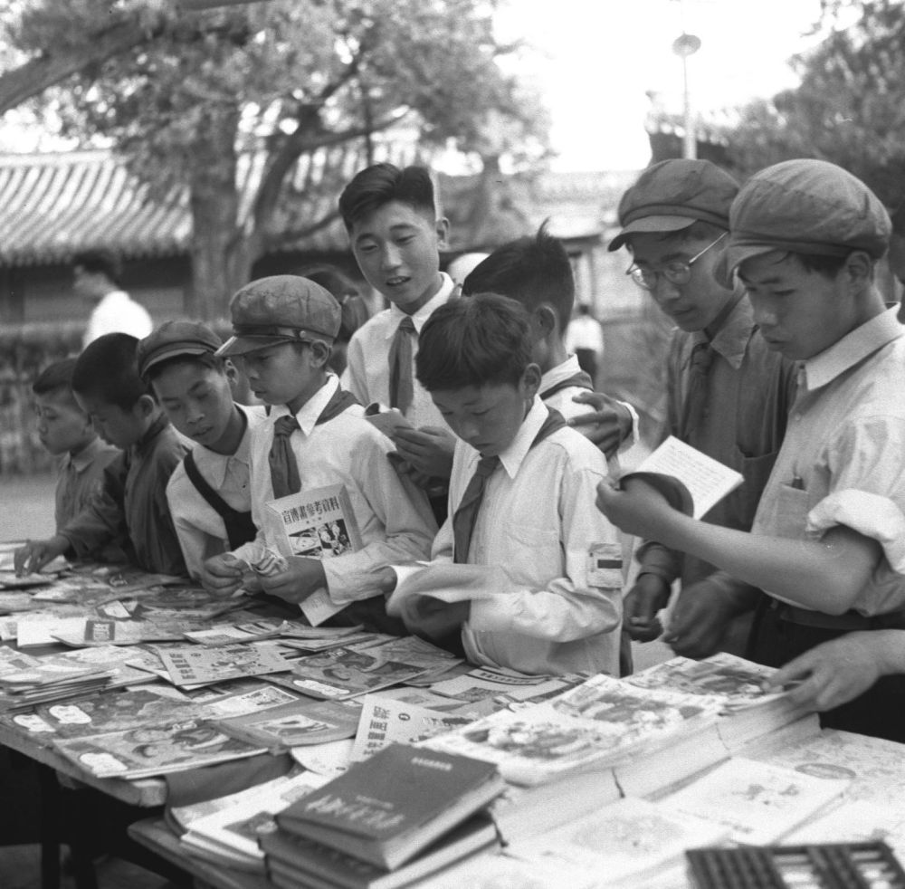 1951年,北京市中山公园内新华书店售书亭为了庆祝六一国际儿童节,为儿童准备了大批儿童读物。图为儿童们在选购以九折出售的儿童读物。