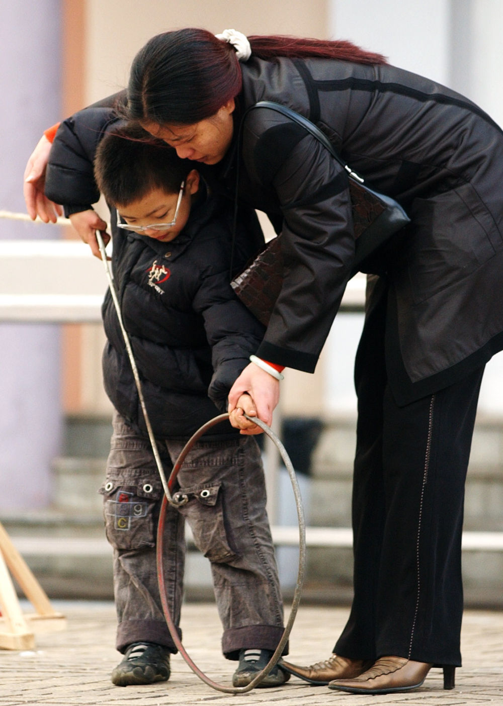 2004年11月27日,一位女士正在教儿子玩滚铁环游戏。