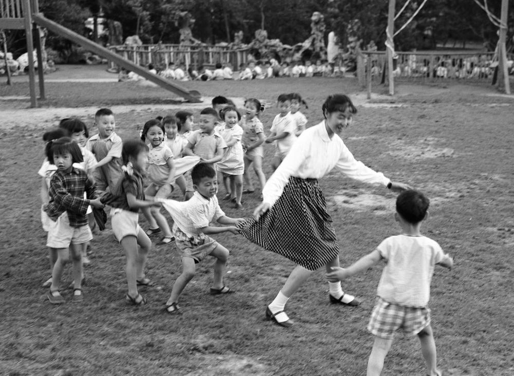 1959年,上海市一个幼儿园的草坪上,孩子们在阿姨的带领下作“老鹰捉小鸡”游戏。