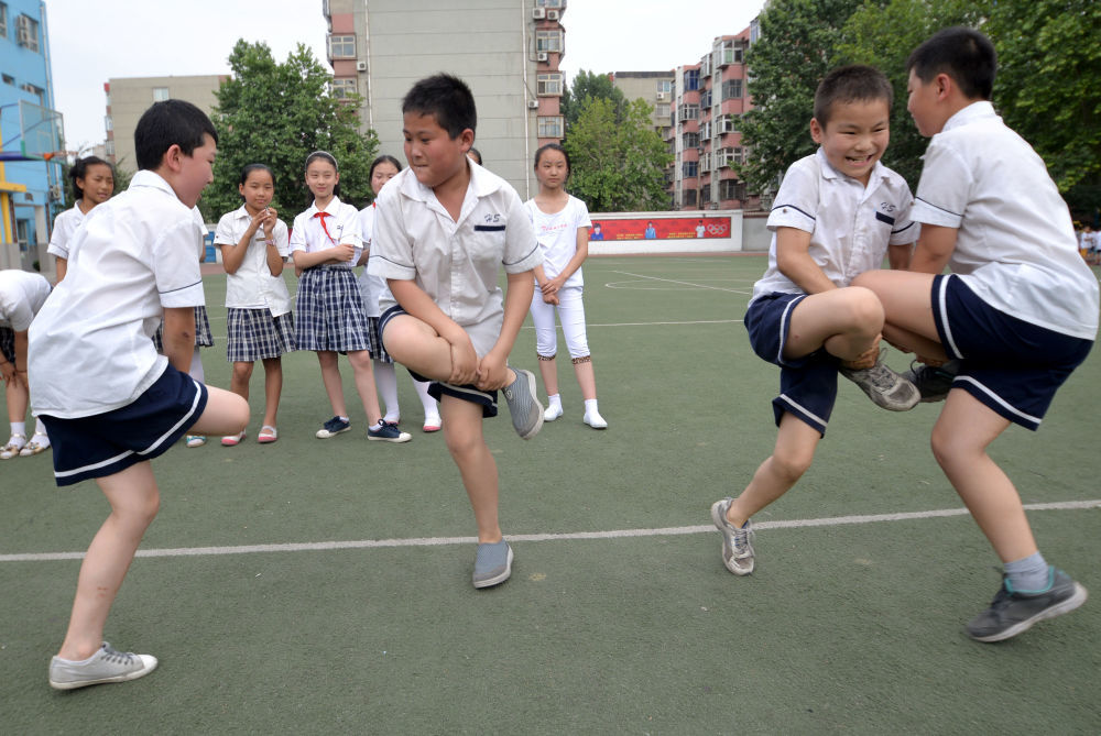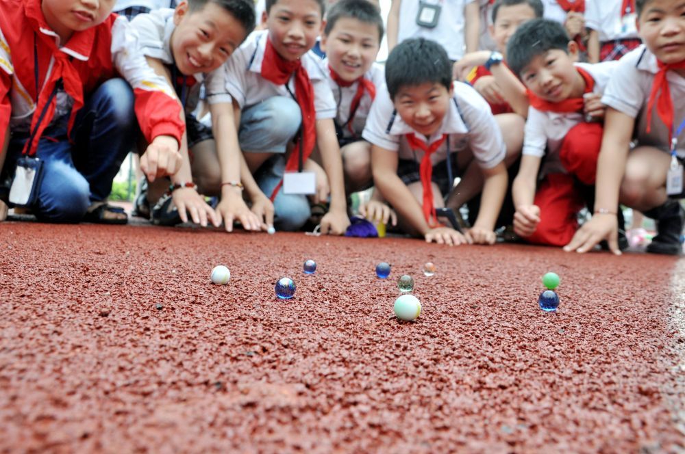2017年5月31日,河北省邯郸市丛台小学的学生玩弹玻璃球游戏。