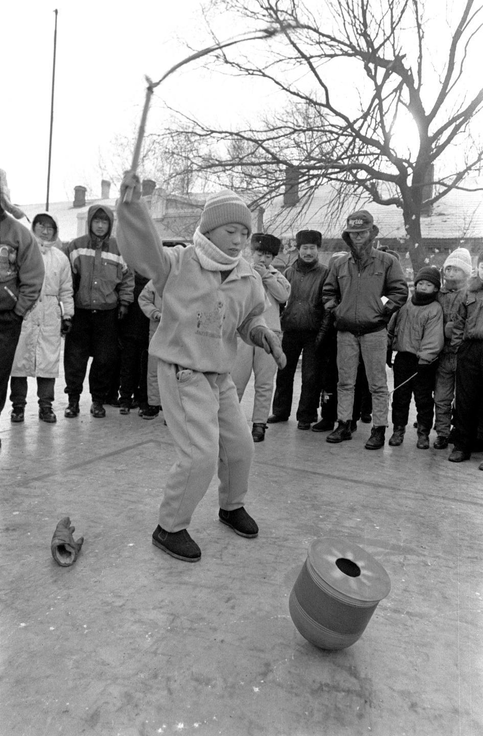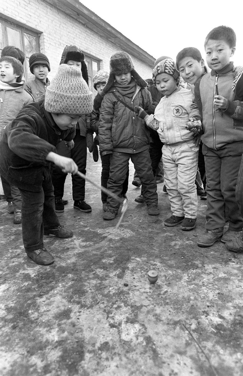 1990年1月,黑龙江省的孩子们在打冰陀螺。