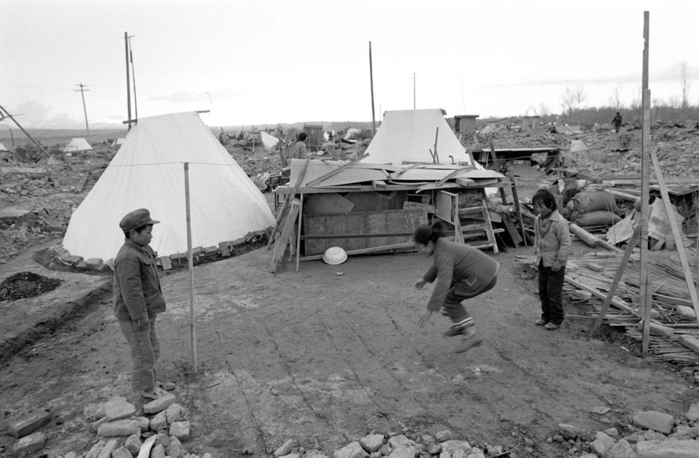 1990年4月,青海省海南地区发生6.9级强烈地震。图为灾区儿童在余震不断时玩起跳房子游戏。