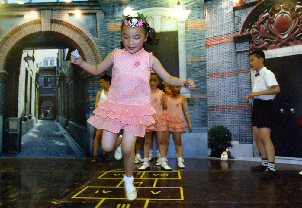 2004年7月10日,首届上海国际少年儿童文化艺术博览会在上海东亚展览馆开幕,这是几名孩子在博览会上玩“跳房子”的游戏。