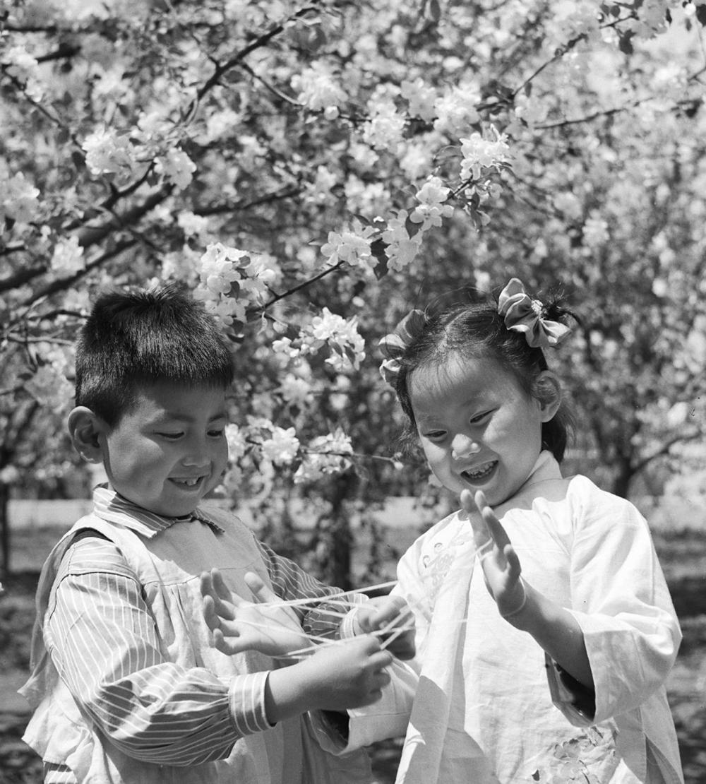 1962年5月,原哈尔滨亚麻纺织厂幼儿园的孩子在做翻花绳游戏。