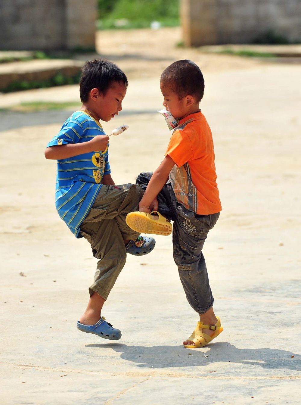 2012年5月3日,在广西大化瑶族自治县大化镇仁良村弄良小学,两名小学生一边吃零食,一边玩“斗驹”。