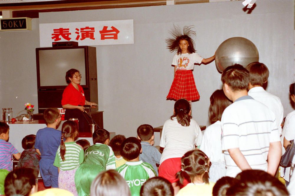 1998年5月31日,许多小学生来到中国科技馆学习科技知识,欢庆“六一”儿童节。这是科技馆工作人员帮助儿童体会人体静电反应。