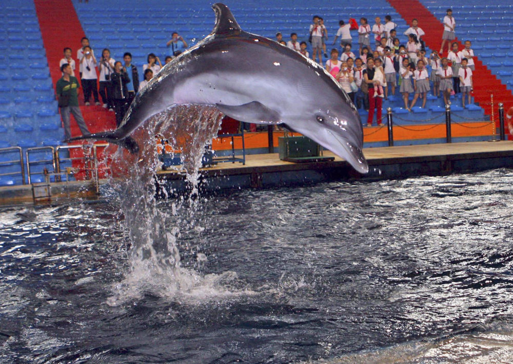 2011年5月28日,西安市500多名外来务工人员子女在西安曲江海洋极地公园观看海豚表演。
