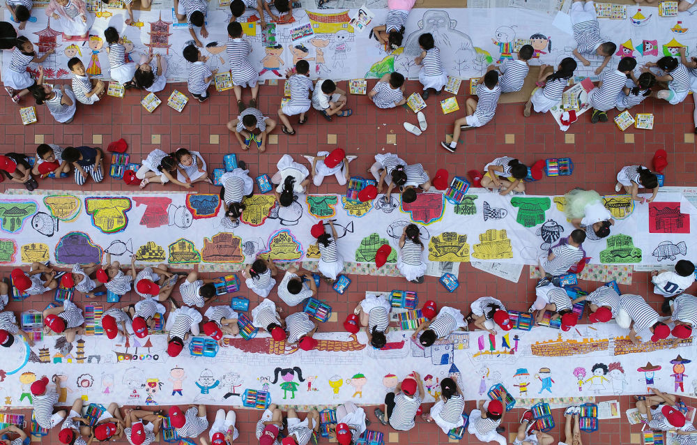 2017年5月31日,福建省泉州市鲤城区机关幼儿园的孩子们在百米长卷上绘画。