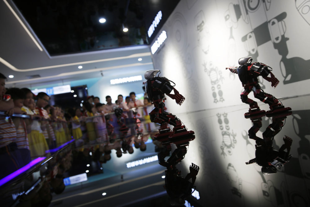 2017年6月1日,百余名小学生在河南省平顶山市宝丰县科技馆内观看机器人舞蹈。