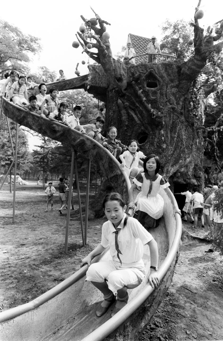 1989年6月1日,为庆祝“六一”儿童节,北京天坛公园当时新建成的儿童乐园向少年儿童开放。图为孩子们正在玩滑梯。