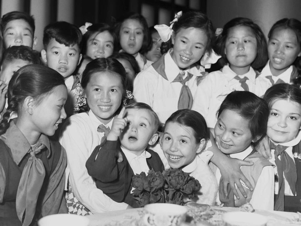 1955年6月1日上午,中外儿童在北京饭店举行联欢,庆祝“六一”国际儿童节。