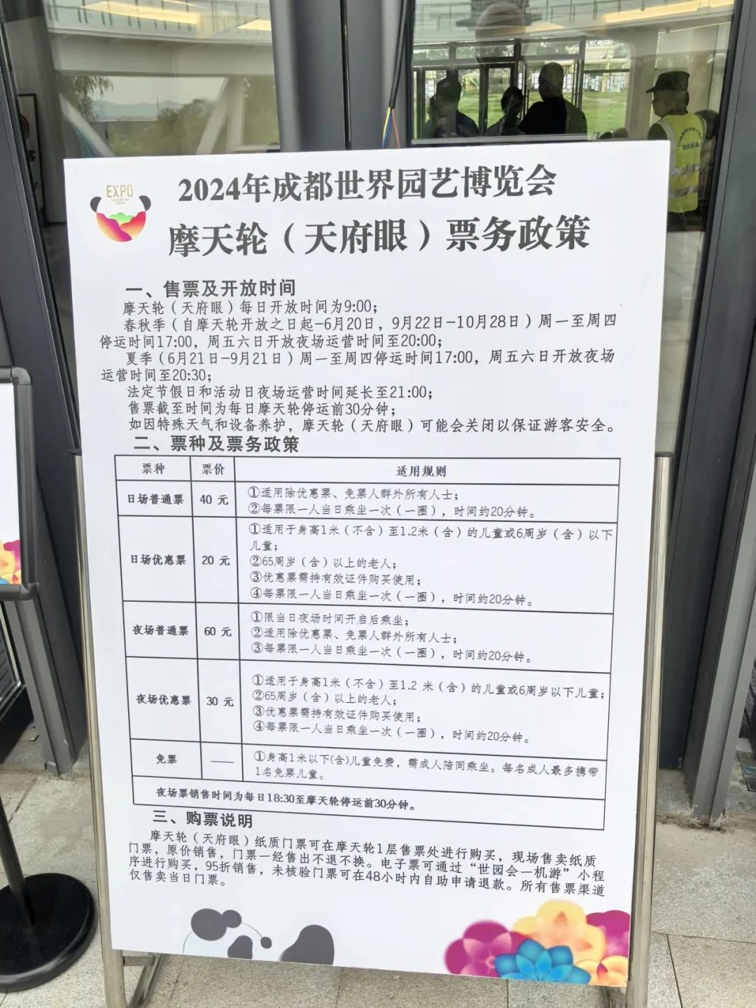 据介绍,摩天轮纸质门票可在摩天轮1层售票处进行购买,电子票可通过“世园会一机游”小程序进行购买,日场普通票为40元,夜场60元,6周岁(含)以下儿童和65周岁(含)以上老人可享受半价,一米以下儿童免票。目前周一至周四停运时间为17:00,周五六日开放夜场,运营时间至20:00。