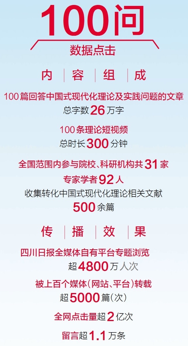 “中国式现代化100问”理论融媒体产品从2023年5月4日开播,2023年5月8日起开始在四川日报思想周刊上刊发,直到2024年5月27日收官,在长达一年的时间里,在读者中产生较大影响,同时,也因为所有作答均为专家的原创及首发,引起全国理论界、学界的高度关注,大家纷纷点赞,“‘100问’是理论新品牌”。