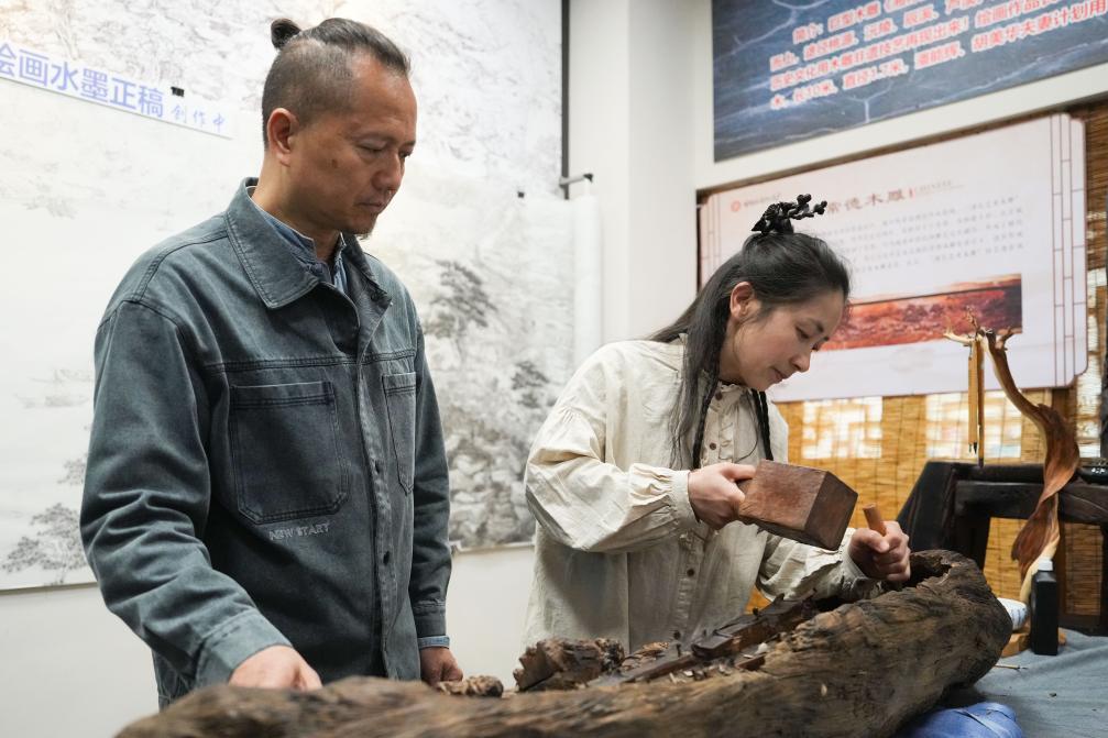 潘能辉和妻子胡美华在湖南常德河街展示木雕。新华社记者 薛宇舸 摄