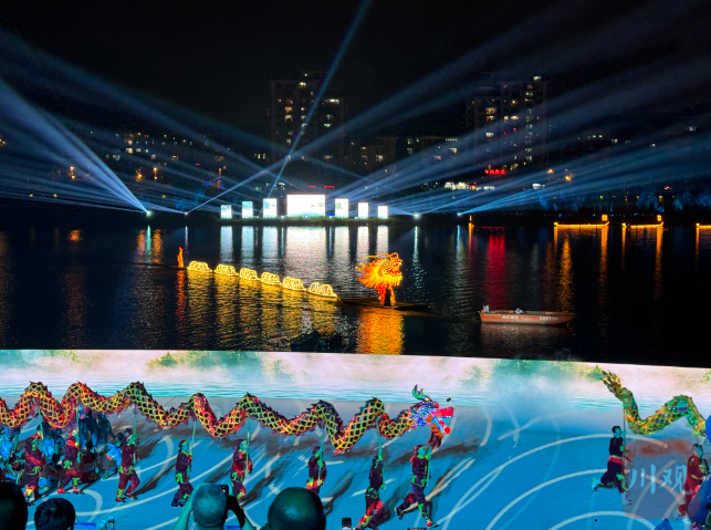 当晚,开幕式现场,一条身长20米左右的飞龙和一只10余米长的彩凤从岸边冲向夜空。随后,一条长30米,由皮划艇巧妙链接的五彩金龙,缓缓游入甜城湖的水面,瞬间点燃了现场观众的热情,“今天的开幕式是近年来首次在夜间举行,希望带给观众不一样的视觉体验。”开幕式演出的相关负责人表示。